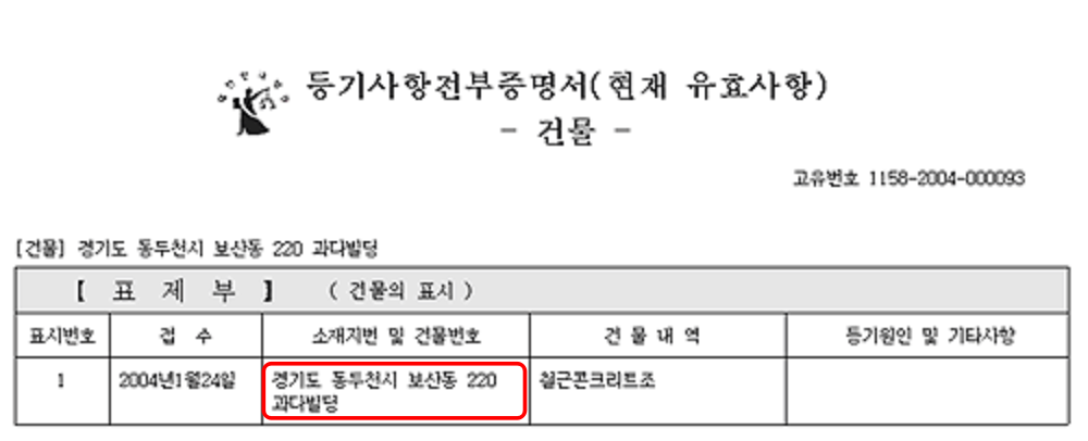 표제부에선 등기일, 건물주소, 건물구조 등을 확인할 수 있습니다. 내가 거래할 부동산의 주소가 맞는지 확인해보시면 됩니다.