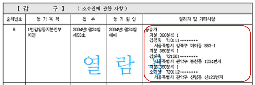 등기부 등본에 갑구에서는 소유자 정보를 알 수 있습니다. 부동산을 단독소유했는지, 공동으로 소유했는지 확인할 수 있습니다. 이 내용이 중요한 이유는 부동산 거래시 등기부등본 갑구에 나와있는 소유자와 거래를 해야됩니다. 소유자가 아닌 다른 사람이라면 거래할때 주의하셔야 겠죠?