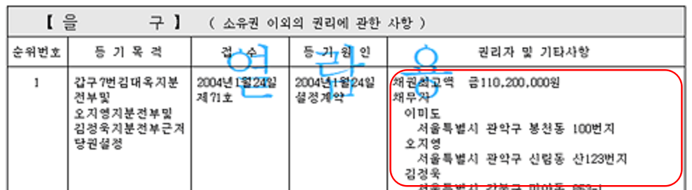 을구는 권리관계에 대해 표시되는곳입니다. 대출 및 근저당권 등의 설정정보를 알 수 있습니다.